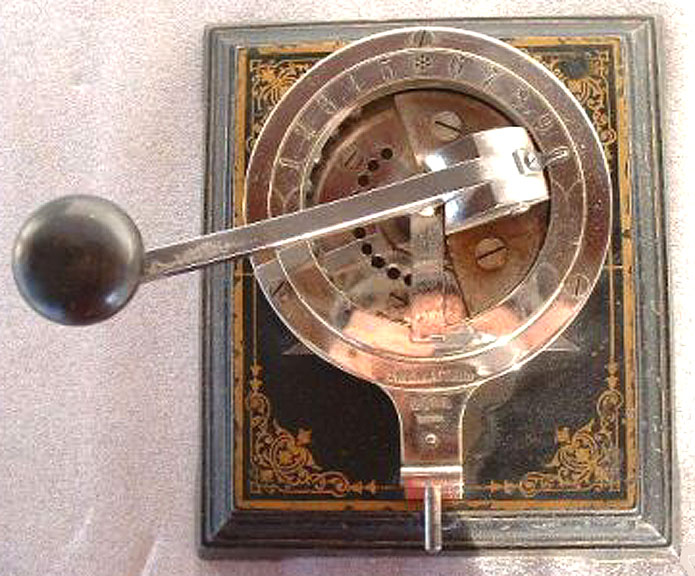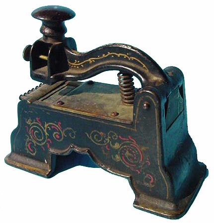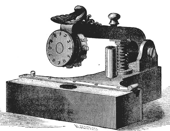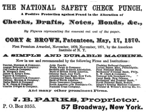 Safety Check Punch  Patented 1870 ~ Exhibition Awards 1870-71, 1874 ~ Advertised 1872-74, 1879 J. B. Parks, New York, NY (1872) John G. Hodge & Co., New York, NY (1874) 1879 Price $25 Photo to right courtesy of Larry Meeker  |
