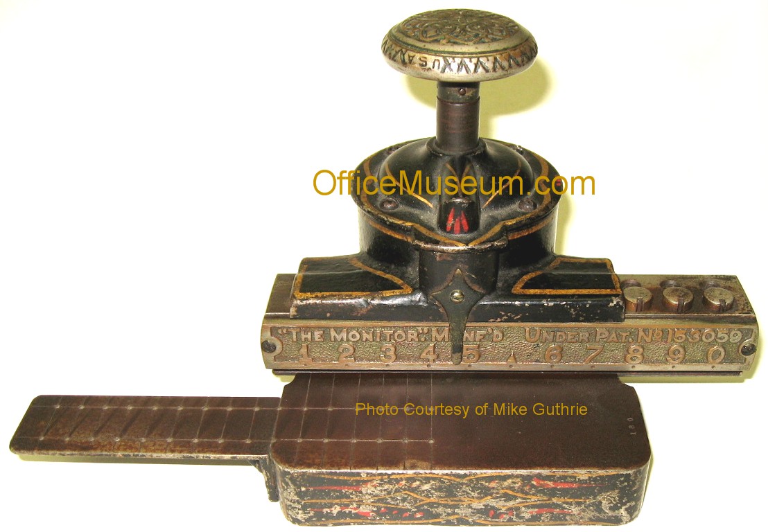 Check Perforator Advertised 1883 Made by R. H. Smith Mfg. Co., Springfield, MA (1883) "Finer in construction and more costly" than the Monitor Check Protector. No image available.  |