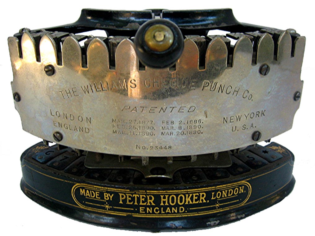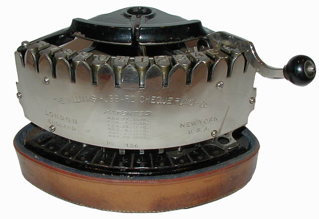 Cheque Punch Patented 1877-90 In 1892 John Newton Williams filed, and in 1893 he received, what appears to be a related patent (U.S. Patent No. 511,313) The Williams Cheque Punch Co. The Williams Hubbard Cheque Punch Co. London, England, and New York, NY  |