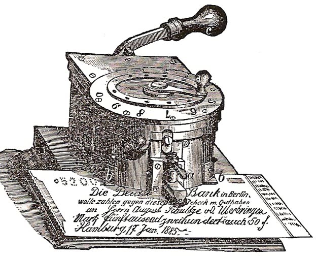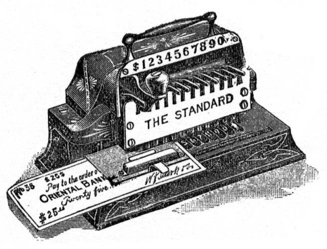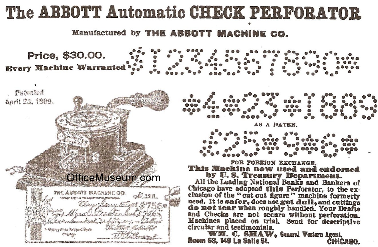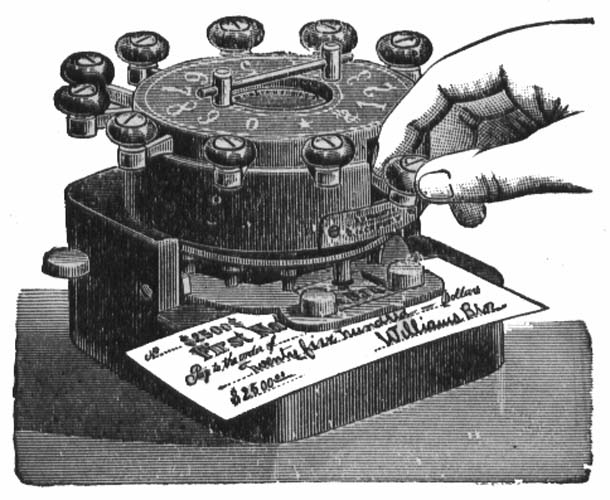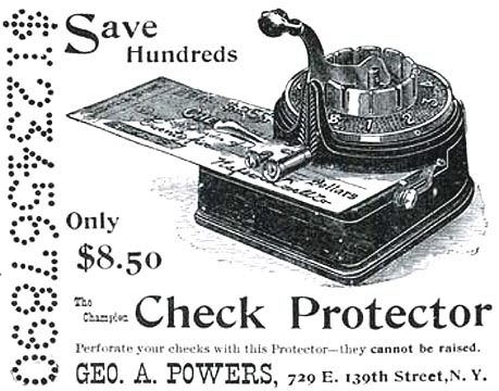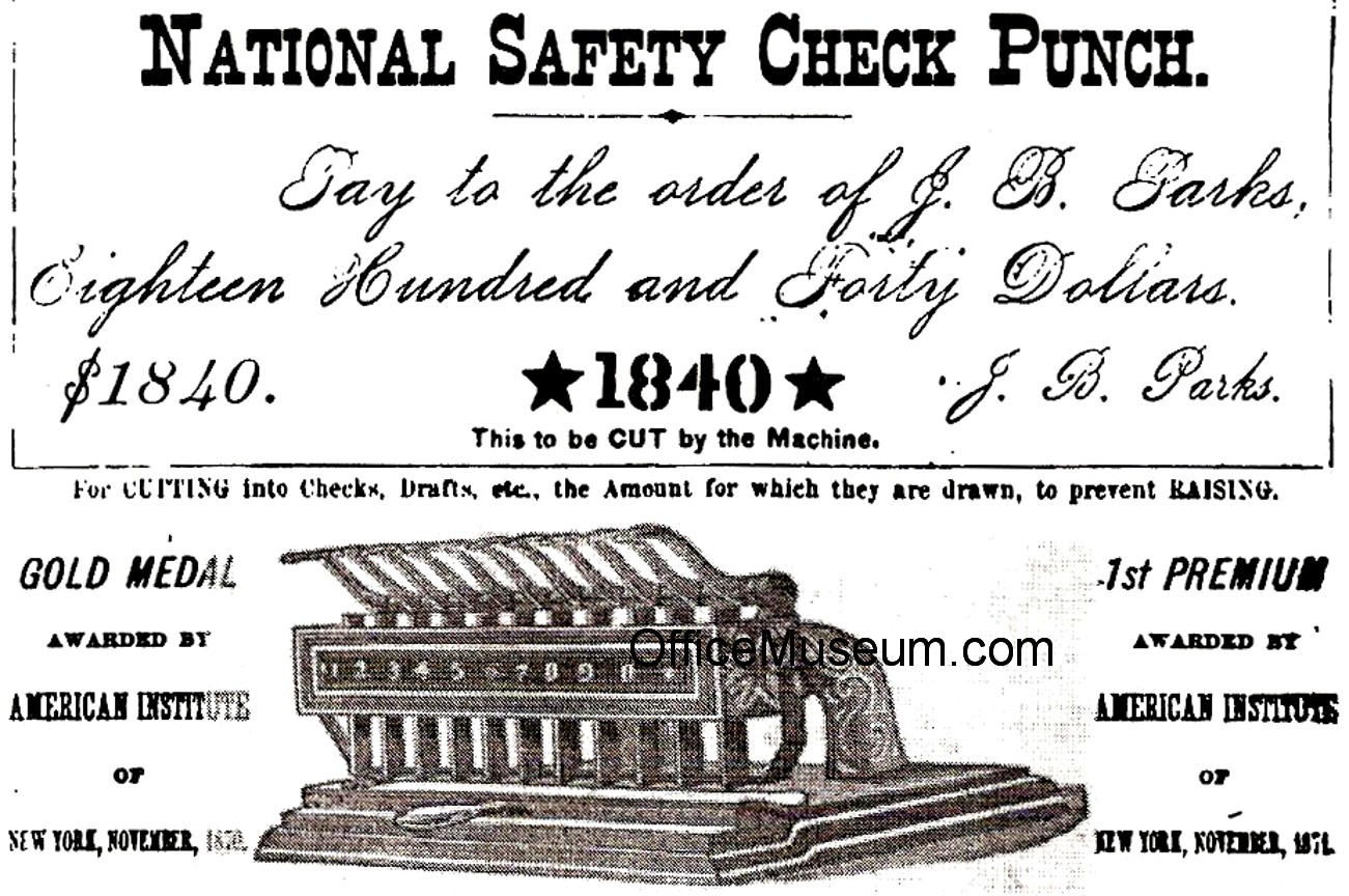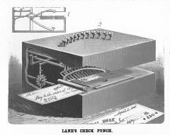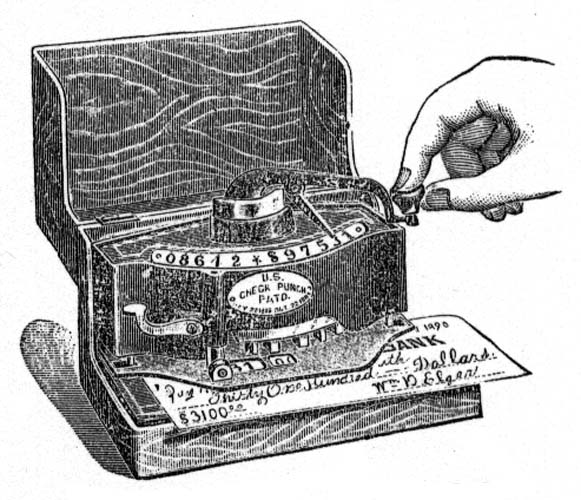 Safety Check Punch Marketed 1893 The Office Men's Record reported in 1893 that "The Matchless Safety Check Punch punctures the paper, breaks the fibre and makes a plain figure."  |