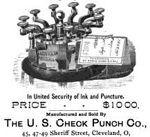 Punch Advertised 1890 U.S. Check Punch Co. Cleveland, OH The "U.S." was said to refer to the "united security" obtained by ink and puncture  |