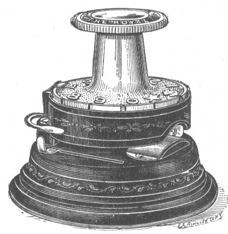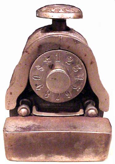 Check Protector (a.k.a. Monarch Check Protector) Patented 1874 (US Patent No. 153,059 awarded to R.H. Smith) ~ Advertised 1883-89, 1892 R. H. Smith Mfg. Co., Springfield, MA (1883) Eaton & Ellsworth (cast on the machine to right) Photo to right courtesy of Mike Guthrie  |