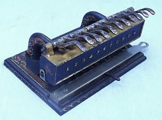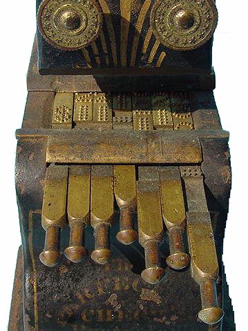 Bank Punch (a.k.a. Automatic Check Punch, Williams Automatic Bank Punch, Williams Brothers Automatic Bank Punch, Roberts Cheque Protector) 1883 and 1884 German publications listed this machine by name as existing in 1882 and 1883 Patented 1884-85 ~ Advertised 1884-1914 Automatic Bank Punch Co., New York, NY, and later Brooklyn, NY Initially made at the Brady Mfg. Co., Brooklyn, NY (1884-85) This machine was invented by John Newton Williams (1840-1929), who went on to invent Williams typewriters (1891-1909). An 1892 advertisement claimed that over 15,000 Automatic Bank Punches were in use. The 1892 price was $25. Also, in 1892 the Clerk of the U.S. Treasury Department took the extraordinary step of stating "To Whom It May Concern" that the Automatic Bank Punch had been "found to serve the purpose better than any other machine in the market." Naturally, this endorsement by the Treasury Department was featured in ads for the Automatic Bank Punch. In 1892, the Automatic Bank Punch Co. also stated "We have just filled large orders for the Treasury and War Departments. Over four hundred thousand United States Treasurer's checks were cut by the AUTOMATIC last year." An 1896 ad claimed that over 18,000 Automatic Bank Punches were in use. This ad also stated that the new improved model cut the number "3" with a flat top, rather than the rounded top cut by earlier models. An 1897 ad claimed that two-thirds of bankers and banking houses in the US used Automatic Bank Punches. An 1899 ad claimed that over 22,000 Automatic Check Punches were in use.  |