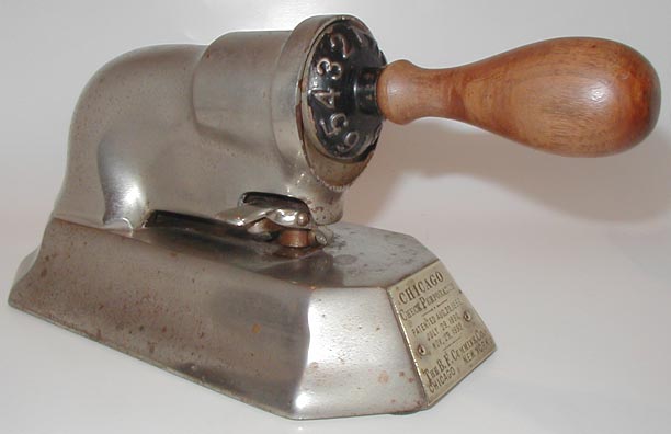 Chicago Check Perforator Patented 1889-92 ~ Advertised 1890-1930 B. F. Cummins Company Chicago, IL, and New York, NY 1893 Price $15. Price reduced to $10 in 1895. 1899 Price $10. An 1899 ad stated that the number of Chicago Check Perforators in use was larger than the number of all other makes combined. The claim was carefully worded so that the comparison was only among check "perforators," and therefore did not include check punches. That said, a 1903 ad stated "43,000 in daily use." If accurate, this claim indicates that before 1903 the total number of Chicago Check Perforators that had been sold exceeded the number of Automatic Bank Punches that had been sold (see above).  |
