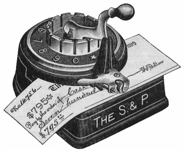 Perforator (a.k.a. Nafew Check Perforator, Nafew-Lovell Check Protector, S&P Check Protector) Patented 1895 ~ Advertised 1895-1922 Geo. A. Powers, NY, NY (Champion, 1895) Samuel Nafew Co., NY, NY (1895-99) Sittman & Pitt Co., Brooklyn, NY (1901-10) Cushman & Denison Mfg. Co., New York, NY (S&P, 1910-16) In 1897, Nafew advertised that it had reduced the price to $5.  |