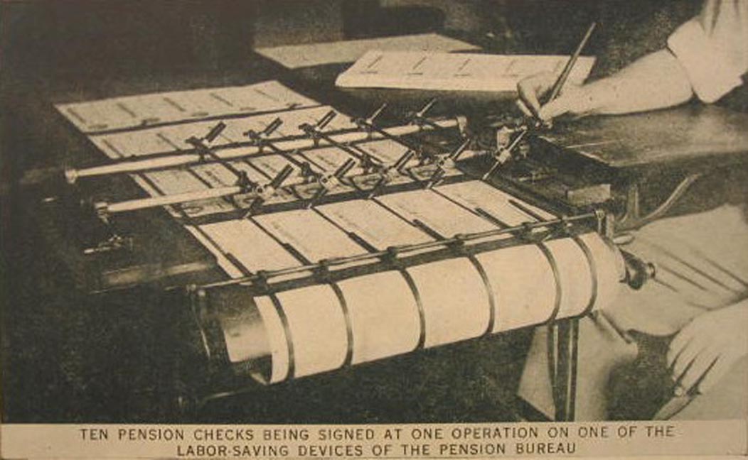 1926_Check_Signing_Machine_at_Pension_Bureau.JPG (89951 bytes) Check Signing Machine, Pension Bureau, US Department of the Interior, Washington, DC, 1926.
