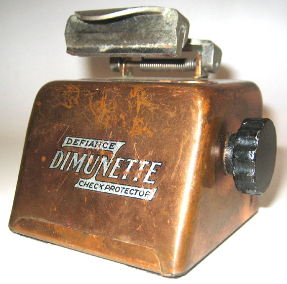 [Check on this: A perforating machine for checks, which may have been a check protector or a check canceler, was exhibited by John R. Hoole of New York, NY, at the 1876 Centennial Exhibition. ] During the last three decades of the 19th century, the principal mechanical check protectors were check punches and check perforators, which cut holes in checks. However, our review of checks for sale on eBay indicates that a comparatively small share of non-government checks during these decades used any mechanical form of protection against alteration of dollar amounts. According to advertisements for the Automatic Check Punch, the U.S. Treasury Department issued hundreds of thousands of checks annually using that particular model of check punch. During the early 20th century, other types of check protectors were marketed, in addition to check punches and perforators. According to Leffingwell, new "check protectors introduced the fundamental principle of forcing into the paper the words representing the amount, making them part of the fiber. The first machine operating on this principle was fitted together in 1899. This early model [made by G.W. Todd] embossed the approximate amount of a draft into the paper, using black ink, in the form of a 'Not Over' or limiting line. The succeeding years, up until 1913, were experimental variations on the 'shredding principles.' The result was the perfecting of a check-writing machine shredding the amount of checks." "In 1914 a figure-writing check writer was placed on the market [by Hedman]. This machine printed the amount line of a check in figures, stamping the imprint through the paper of the check. In 1917 a new model appeared on the market [made by Hedman, with another made by Safe-Guard] which had diagonal writing and perforation over the payee's name. In 1919 a check protector [made by Checkometer] which printed the amount in numerals and at the same time perforated an uninked design over the payee's name appeared on the market." (W. H. Leffingwell, The Office Appliance Manual, 1926, pp. 185-89.) Following the present page, the Early Office Museum's first exhibit covers check punches and perforators from 1869 through 1899. The second exhibit covers check protectors from 1900 to the 1920s. The third exhibit covers simpler check protectors, including handheld devices and ones that embossed fine quilted patterns over the writing on checks. The fourth exhibit covers canceling machines, the fifth covers revenue stamp mutilators, and the last covers check signing machines. Ways in which Check Protectors Attempted to Prevent Alteration of the Amounts on Checks For additional photographs of check protectors, see Michael A. Brown, Antique Check Writers: A Collector's Guide from A to Z, 1998, and Thomas A. Russo, Office Collectibles: 100 Years of Business Technology, Schiffler, 2000. Buy purchase buying purchasing sell selling antique vintage early victorian old checkwriter check protector punch perforator writer imprinter embosser for sale  |