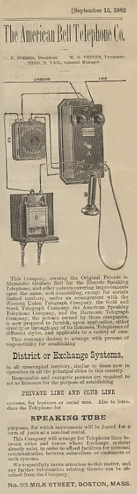 | Telephone Alexander Graham Bell demonstrated a telephone at the 1876 Centennial Exhibition in Philadelphia. The first telephones were point-to-point systems, and Yates reports that "early installations of point-to-point telephones often linked the office and factory of a single firm....Beginning in the 1890s, private branch exchanges were widely adopted to link many locations within large facilities." (JoAnne Yates, Control through Communication, 1989, p. 21) More information on early telephones is provided below.  |