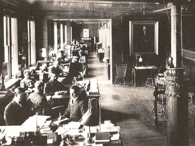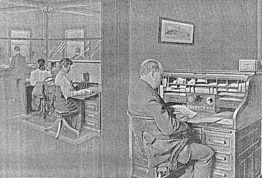 tubes and annunciators.   We have found three photographs of offices with speaking tubes, all of which, are shown to the right. In the middle photograph, four speaking tubes are visible at the front left. In the bottom photograph, a button that operated an electric call bell is visible below the mouth-piece of each speaking tube on the pillar on the right side of the photo.  |