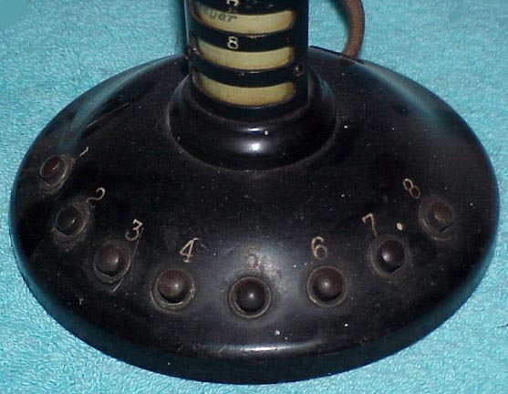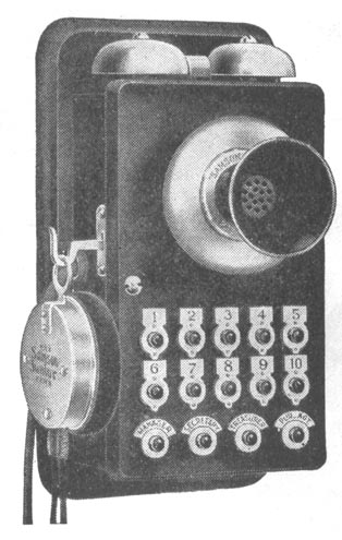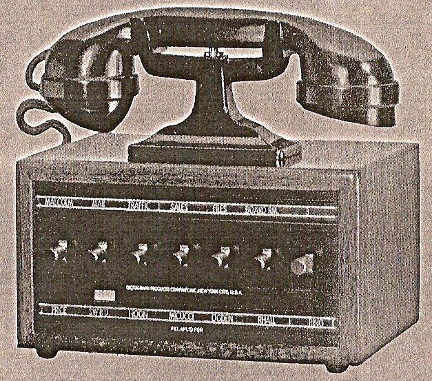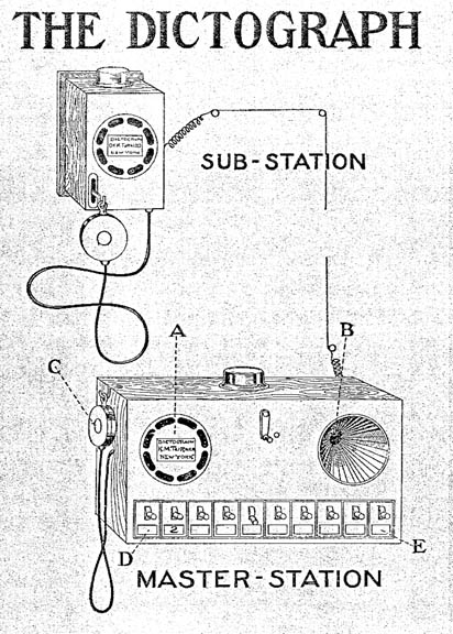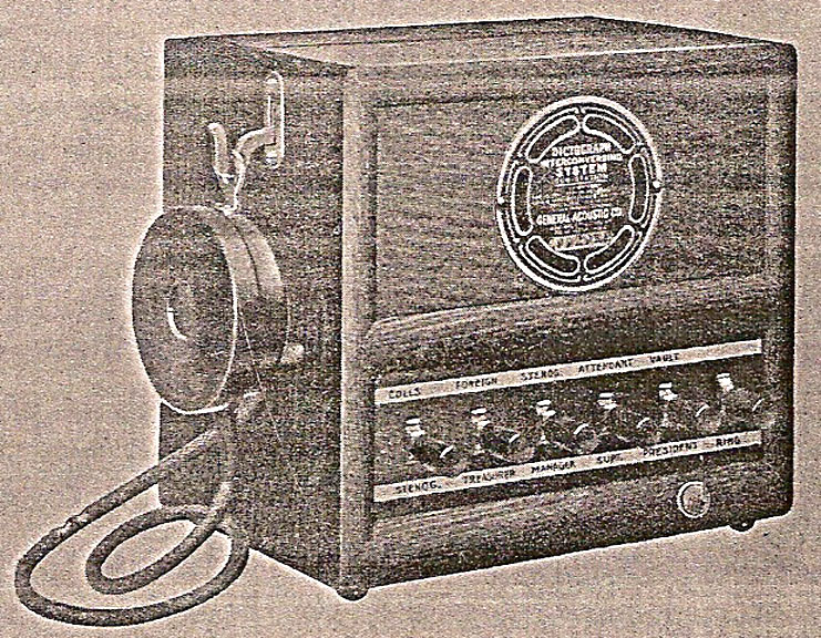 A 1937 text states: "The Dictograph is frequently used, particularly in large organizations where a supplementary inter-communicating system which provides direct connection between a relatively small number of individuals, often officers and chief executives, is desired. The receiver and mouthpiece are similar in appearance to the hand telephone. Connection is made by the person calling simply by depressing a small key, which is marked to indicate a particular individual." (John S. MacDonald, Office Management, 1937, pp. 87-88, showing a unit similar to that in the lowest photograph to the right)  |