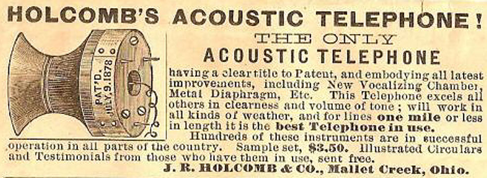 Holcolm's Acoustic Telephone, 1879 ad  |