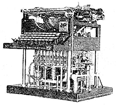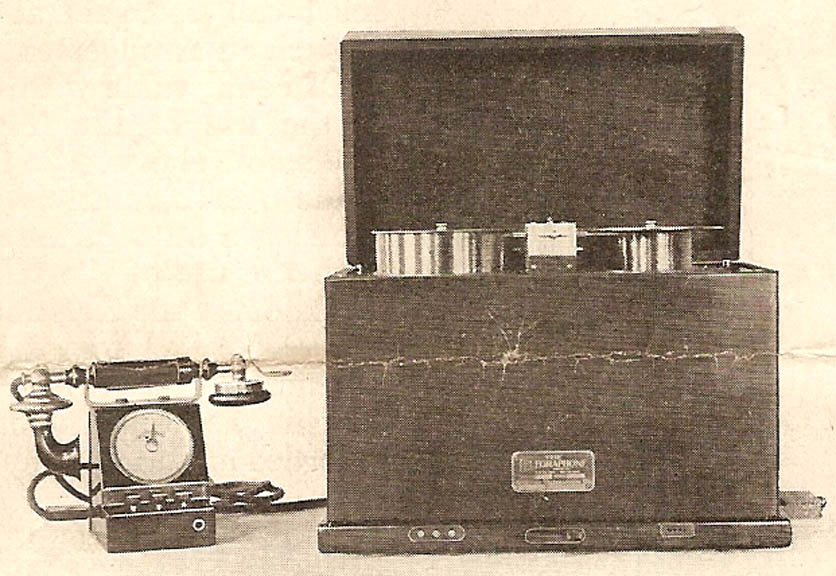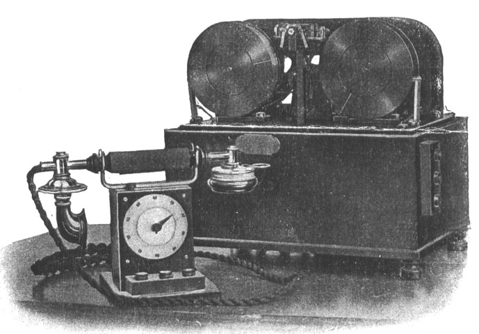 According to an 1889 report, Malone Wheless invented a telegraphone that recorded telephone messages, but we have found no evidence that this device was manufactured commercially. (The Phonographic World, Oct. 1889, p. 44) In 1898, Valdemar Poulsen, a Dane, obtained the first patent for electromagnetic sound recording. In 1900, he demonstrated a telegraphone based on his patent. The U.S. rights were purchased by the American Telegraphone Co. in 1903. This company was still in business in 1923. The telegraphone could record sound from live dictation or from a telephone line and could play back the recording through a speaker or over a telephone line. As a result, it could be used (a) to record dictation to be played back to a stenographer on the same machine or to be sent to a stenographer over a telephone line; (b) to record a two-way telephone conversation; (c) to record telephone messages when no one was available to answer the phone; and (d) to send a pre-recorded message over the telephone to multiple receipt points. There were two types of telegraphone as of 1905. One type recorded magnetically on a steel wire and the other magnetically on a steel disc. The wire telegraphone "contains about two miles of fine (.01 inch in diameter) steel wire, which is sufficient for about a half-hour's conversation, but at any time a message or all messages may be effectively effaced at will, when the apparatus is ready for new records." It has recently been reported that "the most successful of the early office dictation Telegraphones was the Model C [produced in 1911], with horizontally-mounted spools for better wire control" (in contrast to the earlier 1905 model top right, which had vertically-mounted spools). (Pavek Museum of Broadcasting) In the case of a disk telegraphone, "the record is made on a thin metal disc. The record is quite permanent, and can be removed only by a strong magnet, which, however, will efface it altogether." The disc telegraphone pictured to the right had a recording capacity of 2 minutes per disc. For a 1905 photograph of a different disc telegraphone model that used a smaller disc, see Harper's Weekly, July 1, 1905. According to an article published in 1906, "the telegraphone is not in use as yet among the business public." (E.F. Stearns, "A Spool of Wire Speaks," Technical World Magazine, Dec. 1906, pp. 409-12.)  |