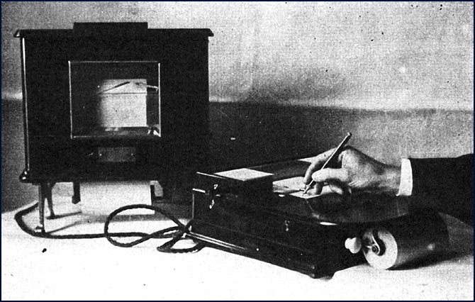 | Facsimile Machines During the 19th century, at least three systems were invented for transmitting copies of messages, drawings, and photographs. These systems used a transmitter with a stylus that passed over the message or image numerous times, and activated a remote receiver with another stylus that drew a facsimile. The first of these systems was introduced by Alexander Bain, a Scot, in 1842. This system was not a commercial success. Another system was introduced by Frederick Bakewell in 1848. And another system was introduced by N. S. Amstutz c. 1892. The top two images to the right show Amstutz's Electro-Artograph. According to the description, when a stylus in the transmitter went over a specially prepared photographic image, a stylus in the receiver created a line engraving that was ready for press printing. For further information on the Anstutz system and an example of an image created by the receiver, see "The Photo-Electro-Artograph," American Journal of Photography, Jan. 1892, pp. 34-35, and N.S. Amstutz, "Acrograph Engraving Machine," The Photographic Times, 1899, pp. 446-47. Arthur Korn introduced the first practical photoelectric technology for scanning and transmitting photographs in 1902. During the mid-1920s, Western Union and other companies introduced photograph transmission services, mainly for use by newspapers, and in 1930 Western Union introduced facsimile message service. The bottom photo to the right shows Warren Jones in New York watching the signature of his client Ralph Beaver Strassburger, a wealthy businessman, being transmitted by wire from London. The photo is undated, but the internet has many references to Mr. Strassburger dating from the 1930s. In 1966, Xerox introduced the desktop Xerox Magnafax Telecopier. Office use of facsimile machines expanded during the 1970s and, particularly, the 1980s. The number of fax machines in the US increased from 300,000 in 1982 to 1,500,000 in 1988 (Xerox Crop., Facsimile: A Quarter-Century of Innovation, 1989).. During that period, office workers typed documents, or printed documents created on word processors and computers, and then scanned and transmitted the documents using fax machines. By the end of the 1990s, use of fax machines declined because documents were increasingly transmitted directly between computers over the internet.  |