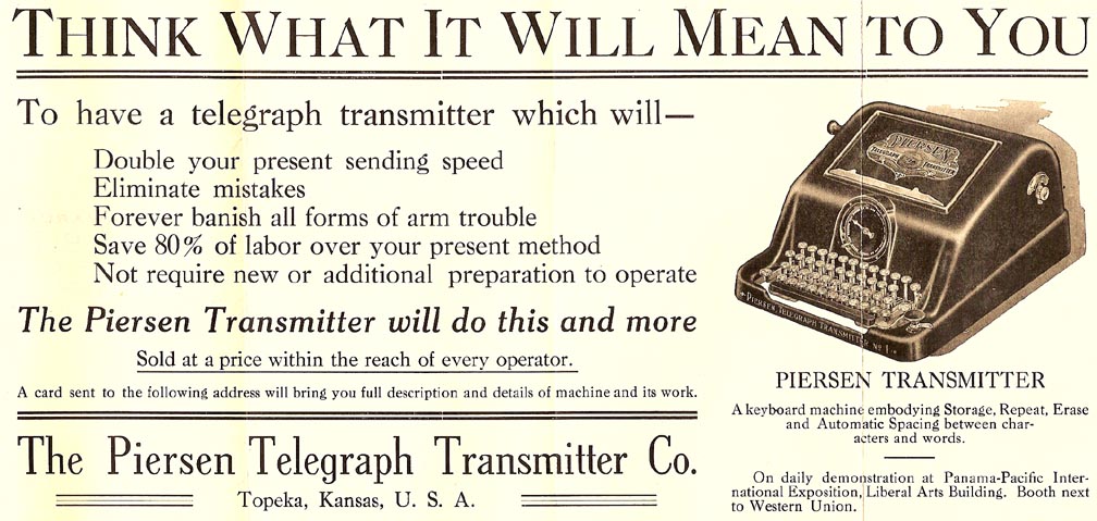 Typewriter Telegraph, Scientific American, Jan. 19, 1895 ![]() Yetman Transmitting Typewriter Courtesy of the Museum of Business History and Technology ![]() Stearns Visible Typewriter mounted on a Burlingame Telegraphing Typewriter, 1908-09 American Keyboard Transmitter, American Transmitter & Mfg. Co. This transmitter, which was advertised in 1910, sent Morse code.