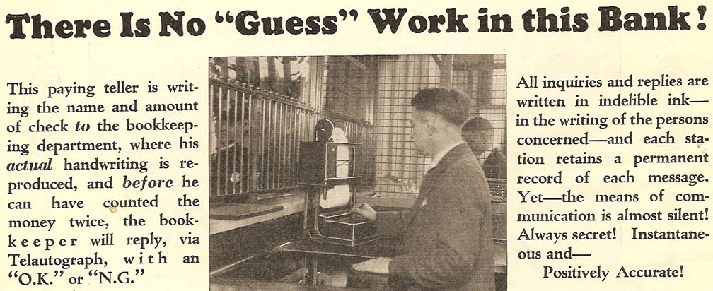 areas. The Gray National Telautograph Co. was still operating in 1905. A 1905 article states that "the telautograph did not come into extensive general use until quite recently. Business people did not begin to take real hold of it till the middle of 1903." The article continues: "the leading banks and trust companies of New York, Boston and Philadelphia have adopted it. In some large banks it is used as an intercommunicating system connecting the various departments. The advantage of the telautograph system in banks lies largely in the value of the records kept of communications. The big insurance companies have also adopted the telautograph. Up to the present these have found it most useful for communications between their policy loan department and the index room where the records of policies are kept on file. Several Wall Street firms have installed the machine in the place and stead of messenger boys for service between their offices and those of the telegraph and cable companies. (H. V. Ross, "Commercial Use of the Telautograph," The Business Man's Magazine and The Book-Keeper, May 1905. This article includes an illustration of a 1905 model telautograph.) According to another report in 1905, an "interesting instrument that one finds in an up-to-date electrically equipped office is the telautograph, which automatically reproduces handwriting in facsimile at a point more or less distant. Where it is necessary to give exact information to a number of persons simultaneously and have the same a matter of record, this instrument is very convenient. For example, a train-dispatcher can announce the movements of trains to a number of officials stationed at different points by simply writing a single message. The device is also employed by newspapers and other concerns for writing bulletins. When used in a bank the cashier or teller may inquire from the bookkeeper as to the amount of balance or other particulars of a customer's account, the message and the answer being noiselessly received." (Harper's Weekly, July 1, 1905. This article includes a photograph of a 1905 model Telautograph.) A 1937 text states: "The Telautograph is used rather extensively for transmitting written messages between offices. Messages are written in longhand with a special pen. The writing is then reproduced in exactly the same way, usually on a roll of paper, at the receiving station." (John S. MacDonald, Office Management, 1937, p. 86) In the 1940s, Telautograph marketed an improved model under the Telescriber name.  |