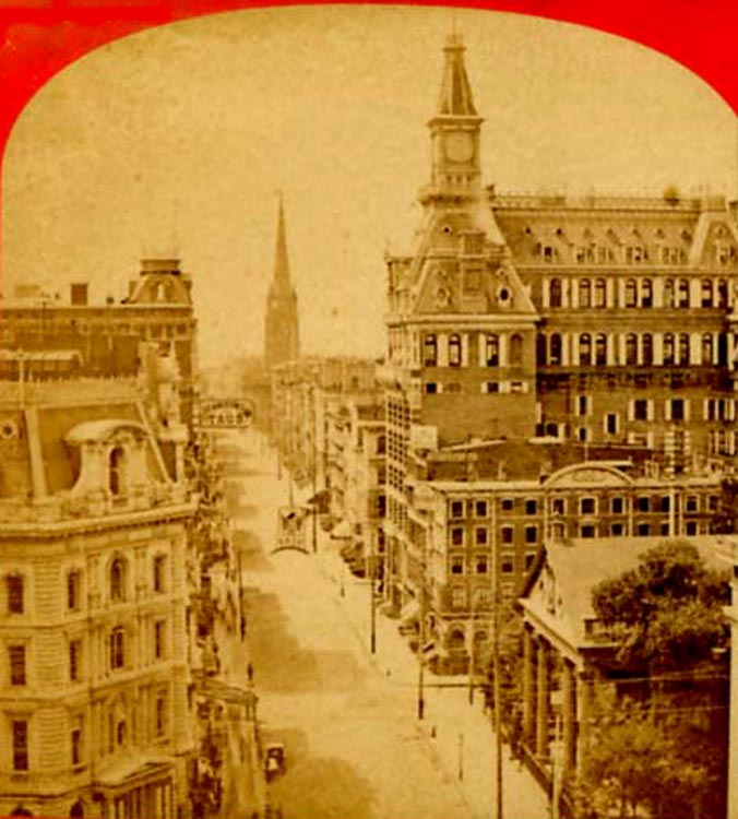 Right: Broadway from the Post Office Building Looking South, c. 1880.