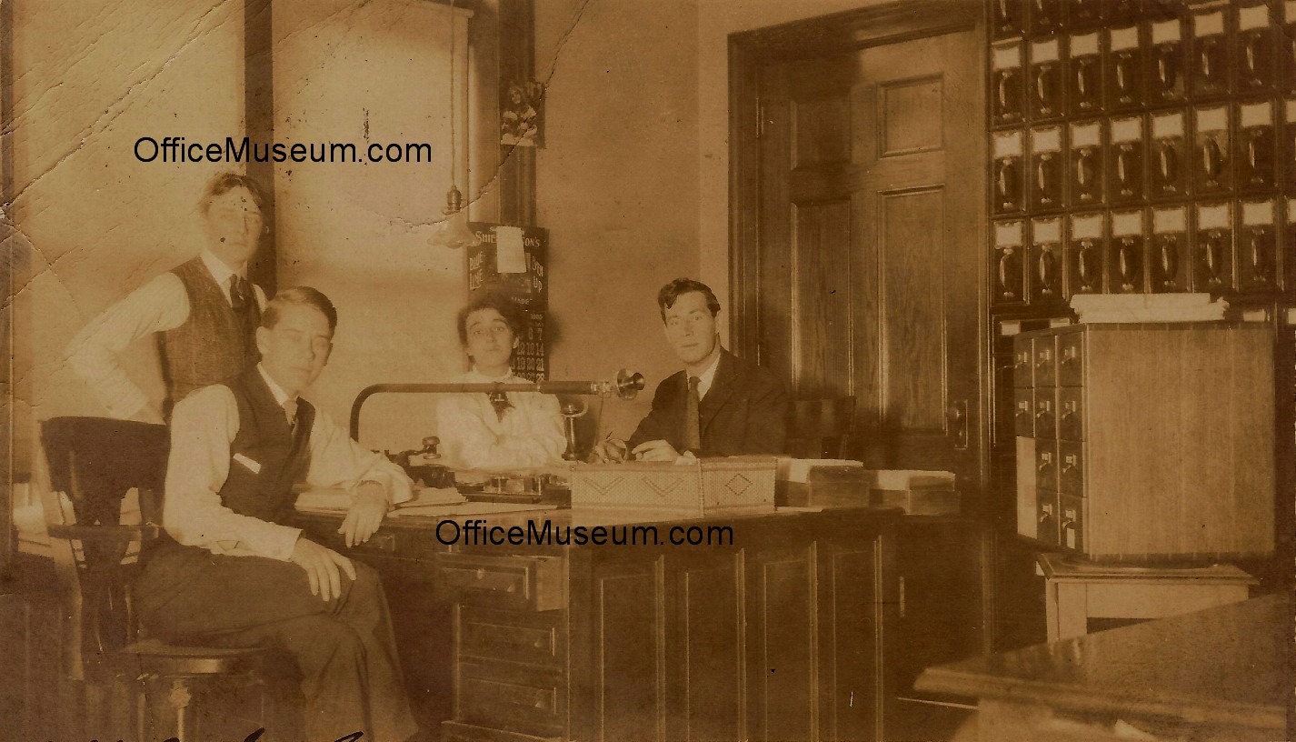 Office with three men and a woman, 1905. A telephone mouthpiece is mounted on a long tube that presumably was swung back and forth so that it could be shared by the men who seated on opposite sides of the partners' desk. There is a large document file. The photo was dated by a wall calendar. | Early Office Museum Archives  |
