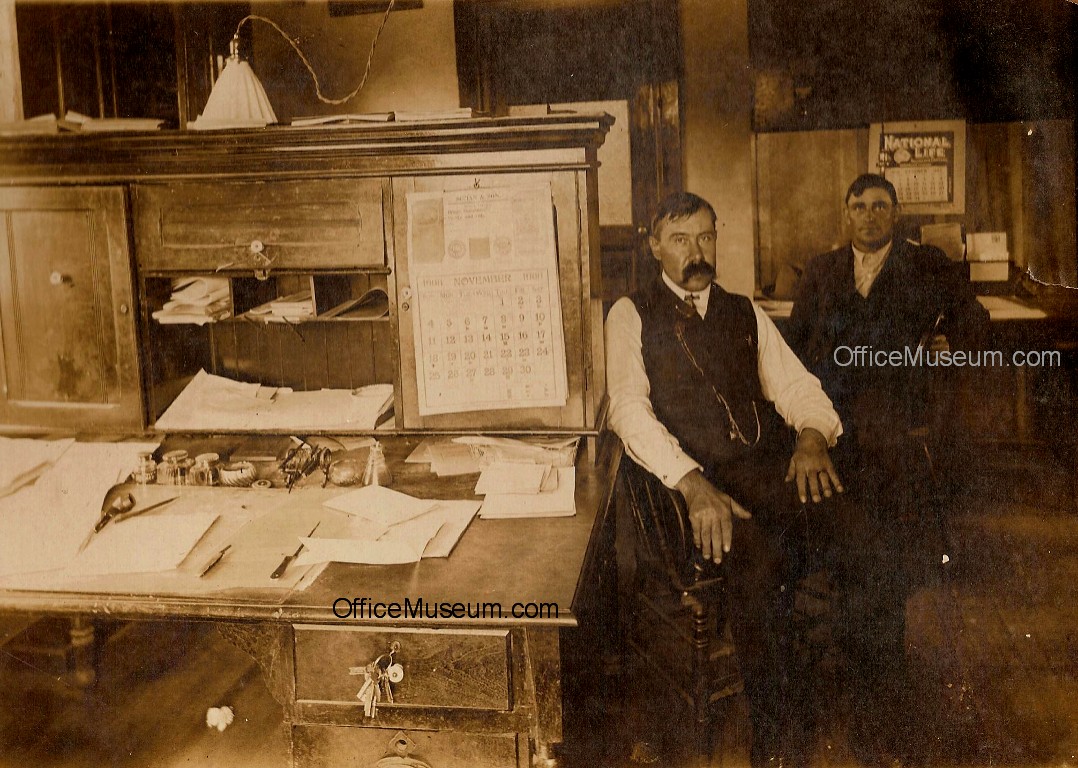 Office interior with a desk from the 1870s, 1906. The office has two 1906 wall calendars. One is an advertisement for the National Life Insurance Company, which was established in Montpelier, VT, in 1848; the company is still headquartered there. | Early Office Museum Archives  |