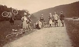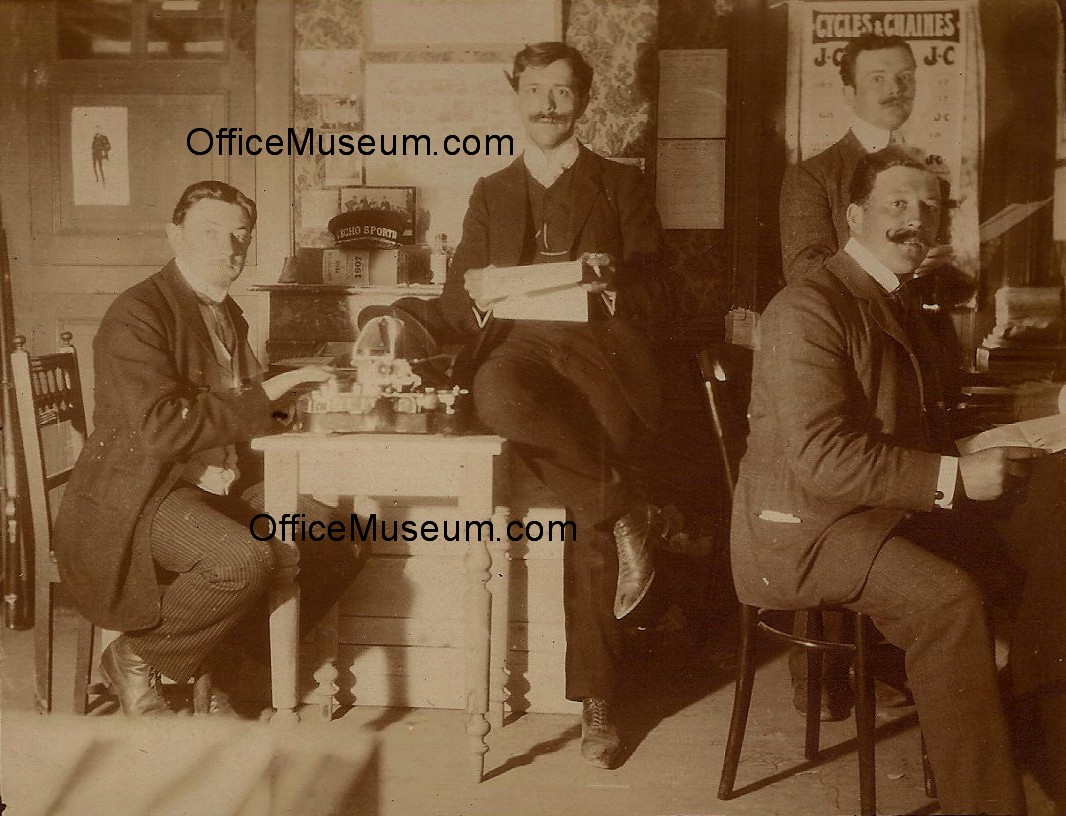 ![]() Office, France, c. 1907. One man is using an Oliver or Courier typewriter. This photo was part of a set of French photos of a group of cyclists; see image to right for another photo in this set. A poster says "Cycles & Chaines" (which translates to "Cycles & Chains," which is a term used in various sciences). The spine of a book has the word "Paris" and the year "1907." A hat has the words "Echo Sport" (which are the same in French and English).  |