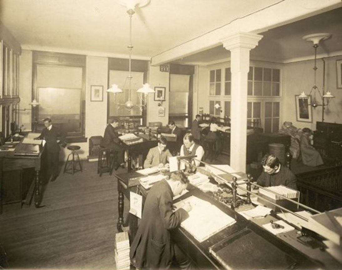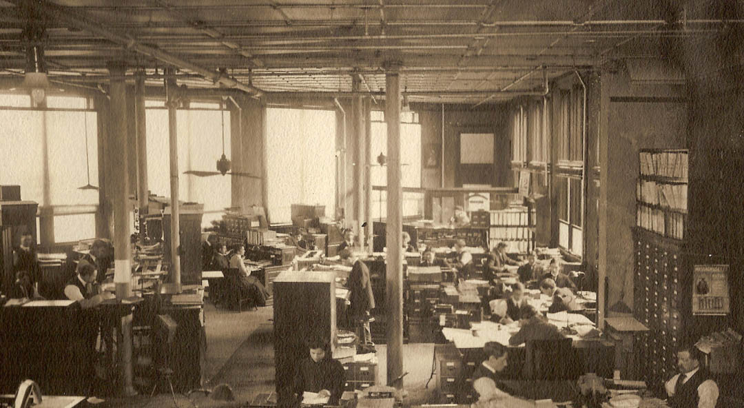 "The Accounting Department, E. & J. Burke, Ltd., Times Building, Times Square, New York," NY, postmarked 1907. E. & J. Burke was an Irish brewery and a New York distributor of alcoholic beverages. All employees in the photo are men. See the photo immediately below for the company's Correspondence Department, where all the employees are women. | Early Office Museum Archives  |