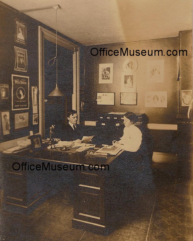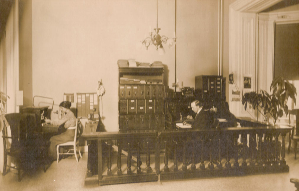 Hospital office with Miss Brady at the telephone switchboard and Superintendent Taul at his desk. Behind Mr. Taul is a sectional filing cabinet and an upstrike typewriter. There are two candlestick telephones. | Early Office Museum Archives  |