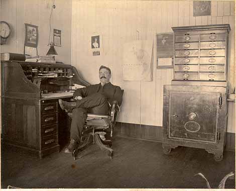 Man at roll-top desk in office with safe and letter filing cabinet. A calendar advertises the National Carbon Company, which existed from 1886 to 1917. The content of the photo suggests a date during the early 1900s. Because a calendar shows that March began on Tuesday, the photo must date from 1904 or 1910. | Early Office Museum Archives  |