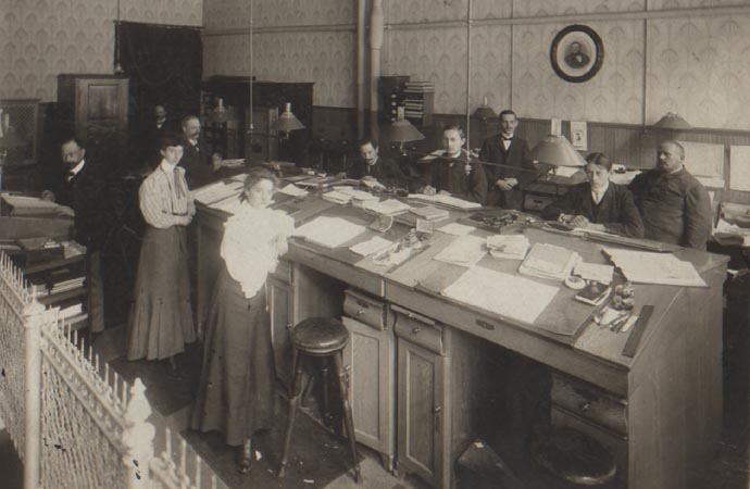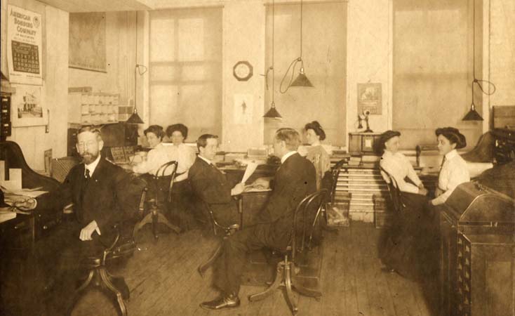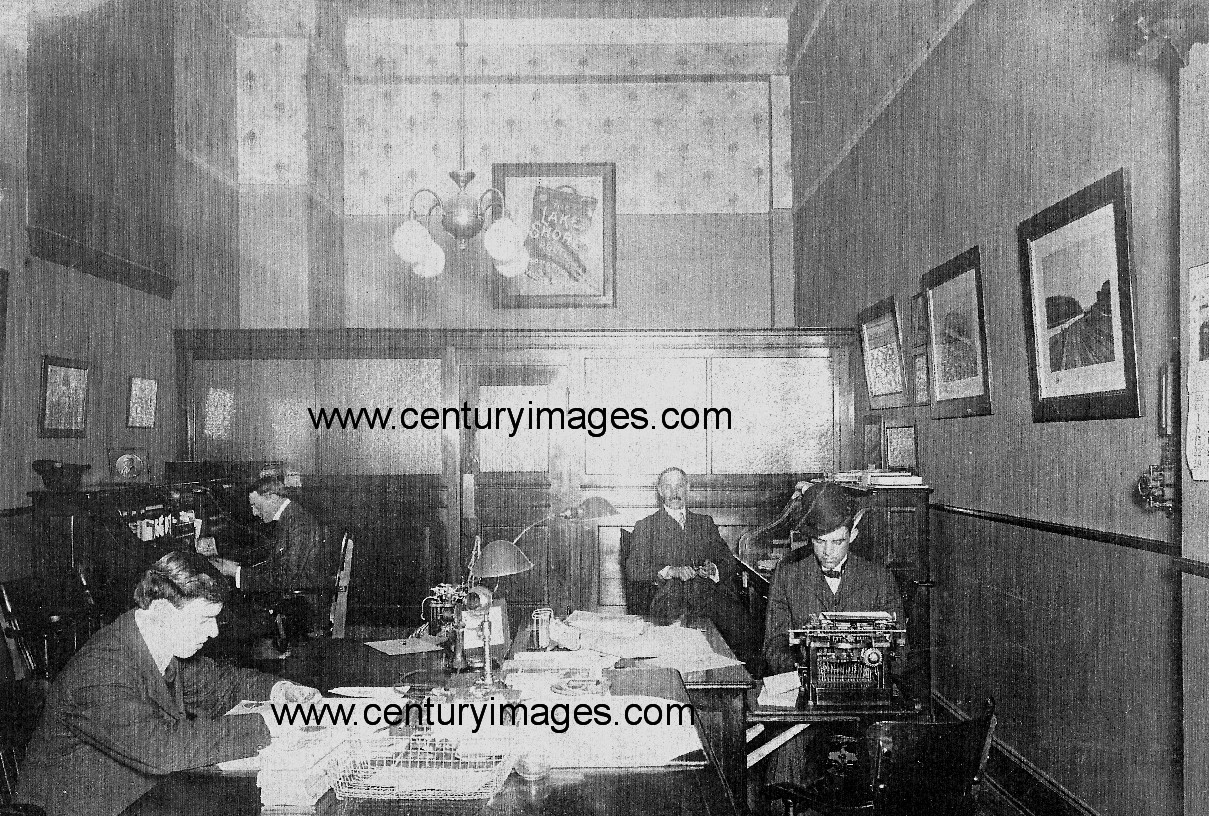 General Office, Milwaukee Sentinel, Milwaukee, WI. The photographer is Jos. Brown of Milwaukee. The office contains candlestick telephones and a letter copying press but no other office machinery. The Milwaukee Sentinel was founded in 1839. In 1995 it merged with the Milwaukee Journal to become the Milwaukee Journal Sentinel. A photo of the home library of Frank J. Stern by the same photographer is glued to the other side of the card to which this photo is glued. Frank J Stern was VP of a dry goods company in Milwaukee during the first decade of the 20th century. | Early Office Museum Archives  |