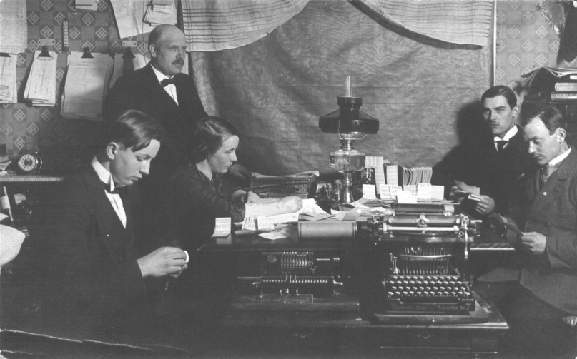 | Five employees using Multigraph machines, 1905. Gammeter Multigraphs, introduced by the American Multigraph Sales Co. in 1902, were used to produce form letters that looked as though they were individually typed. | Minnesota Historical Society, Neg. No. 7636. | |
