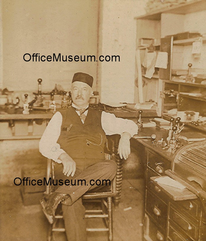 John J Chattarray at desk with many date stamps. | Early Office Museum Archives  |
