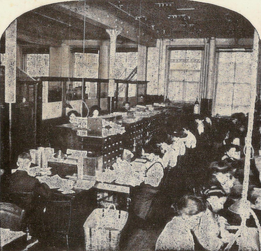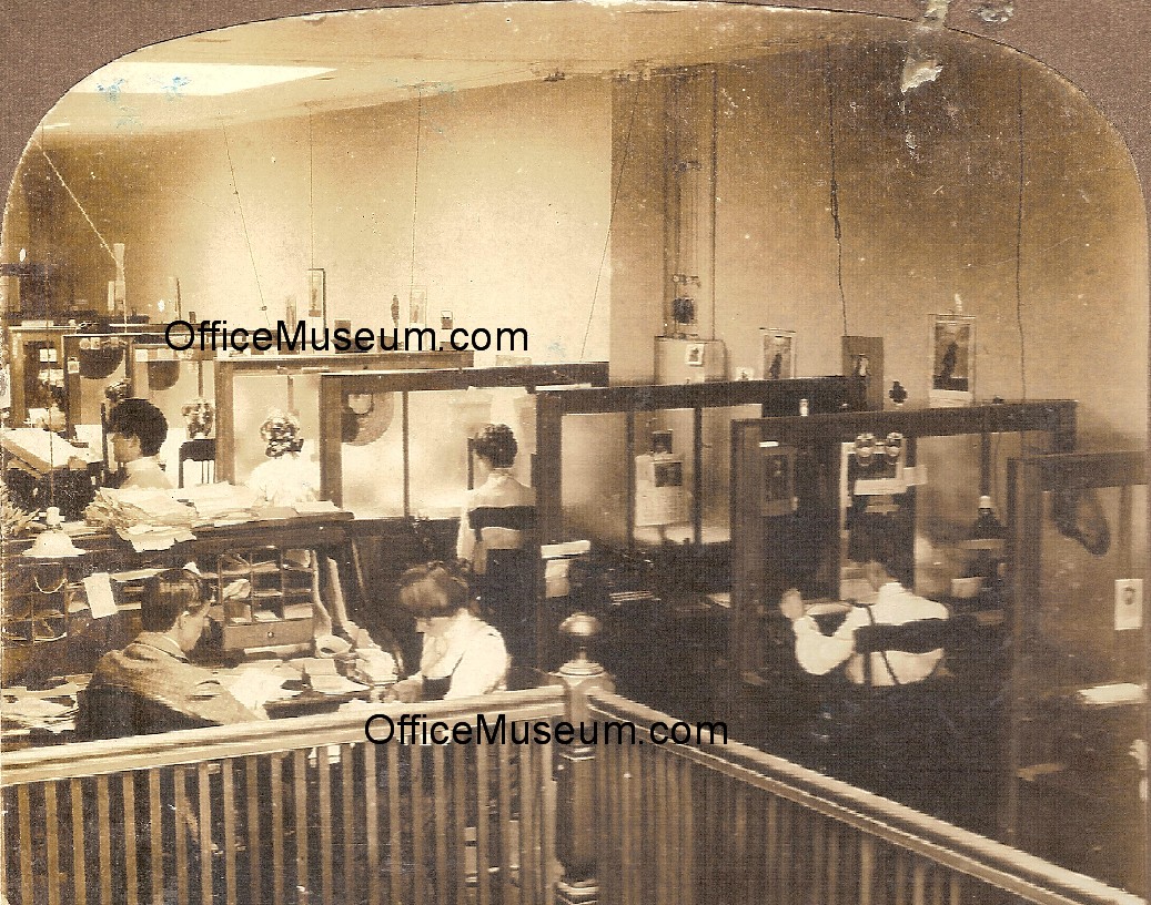 The back of this early 20th century stereoview card states: "Our business has been growing very rapidly and we now own and occupy three floors of the entire building. The picture shows only a small portion of the upper floor. [The picture shows eight booths.] Each of the booths contains a stenographer busily engaged in writing letters to our salesmen and customers. The letters are all dictated by the correspondents and managers of the different departments. In the foreground, near the railing, may be seen one of these correspondents dictating letters to one of the stenographers. Everything has to be done on a perfect system and must move like clock-work in order to get the mail properly read and answered the same day it arrives. The stenographers are under the immediate supervision of the department managers, who in turn make...reports each day to the President and General Manager. This picture gives but a faint idea as to the number of clerks employed on this floor, but it gives a fair idea as to how the room is arranged for their convenience. On the next floor below we have the book-keeper's department, in which are engaged from 6 to 8 expert accountants who are kept busy crediting in the orders as they come from our large force of salesmen, and properly entering these orders on the books of the Company. Here are located the large fire proof vault and safes, built especially for storing the orders with perfect safety as their loss by fire would make an almost irreparable loss. On this floor we have also our letter folding machine. This machine will fold from 20,000 to 30,000 letters per day. We have a very large force of clerks employed on this floor addressing the tags to be used in shipping the stock to our customers. On the different floors of the building are located the private offices of the officers of the Company."  |
