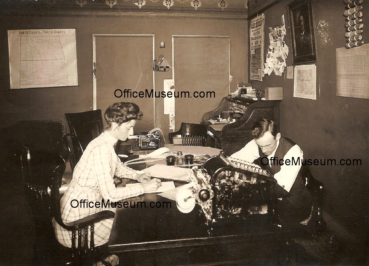 | Office of the Northwestern Farmer, a periodical publication, probably Menominee, MI. Publication years for the Northwestern Farmer included 1907-08. Menominee is on the Michigan-Wisconsin border. A Wisconsin Telephone Company directory and upstrike typewriters are visible in the photograph. | Early Office Museum Archives  |