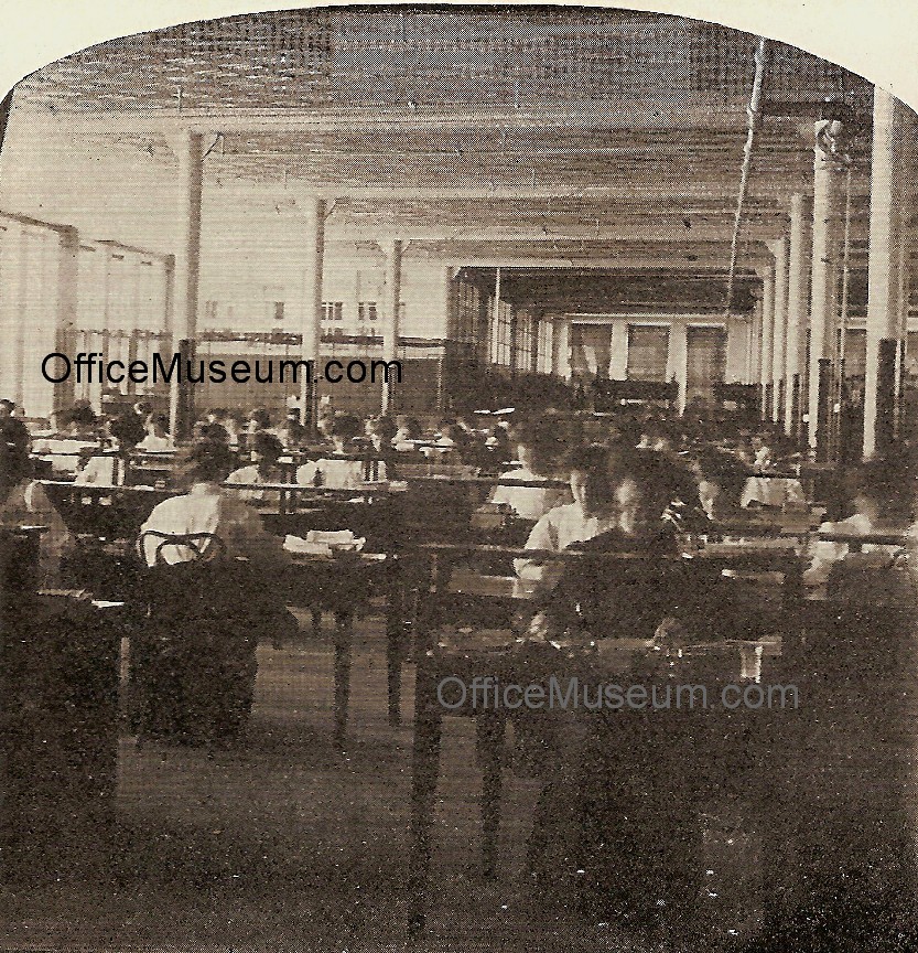 "Making a Record of the Customer's Order," No. 23 in a boxed set of 50 stereographs entitled "A Trip Through Sears, Roebuck & Co.," Chicago, Ill., 1906. The set of stereographs is advertised with a 1906 date in the 1908 Sears, Roebuck catalog. Sears, Roebuck employed nearly 2,500 clerical workers in its administration building. The stereograph card reverse states, "During the busy season of the year, six hundred young women are employed in this room, the picture showing only a portion of this great office. The work of transcribing customers' orders to merchandise order tickets is performed on special typewriters, four hundred of these typewriters being in use at the present time." The special typewriters are Elliott-Fisher book typewriters. | Early Office Museum Archives  |