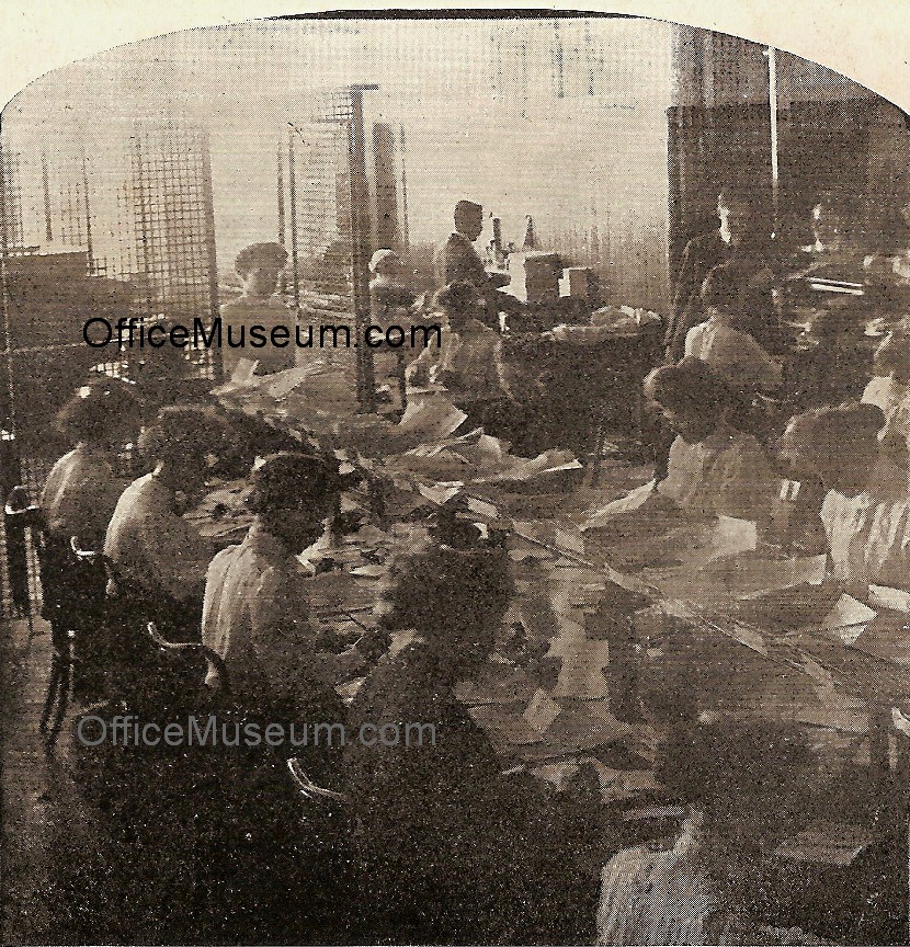 "Section of Mail Opening," from a stereoview series showing various operations of The T. Eaton Co. Ltd, Winnipeg, Manitoba, Canada. Eaton's, which was founded in Toronto in 1869 and went bankrupt in 1999, was Canada's largest retail department store chain. The company introduced a mail order catalog service in 1884. In 1905, it opened a store, and catalog fulfillment business aimed at Western Canada, in Winnipeg. "This picture shows a small section of our mail opening staff, of which there are about 45, including cashiers. Here all our mail is received. The mail order letters are opened by a machine which is capable of opening letters ten times as fast as could be done by the old fashioned hand method. The letters are then given to the mail openers who carefully read them, check the amount of money received, and make out a cash tally showing the amount enclosed. In addition a record card is made out, showing customer's name, post office, station, province, amount of money remitted, and order number. Thousands of letters are handled daily." See also the following photograph. | Early Office Museum Archives  |