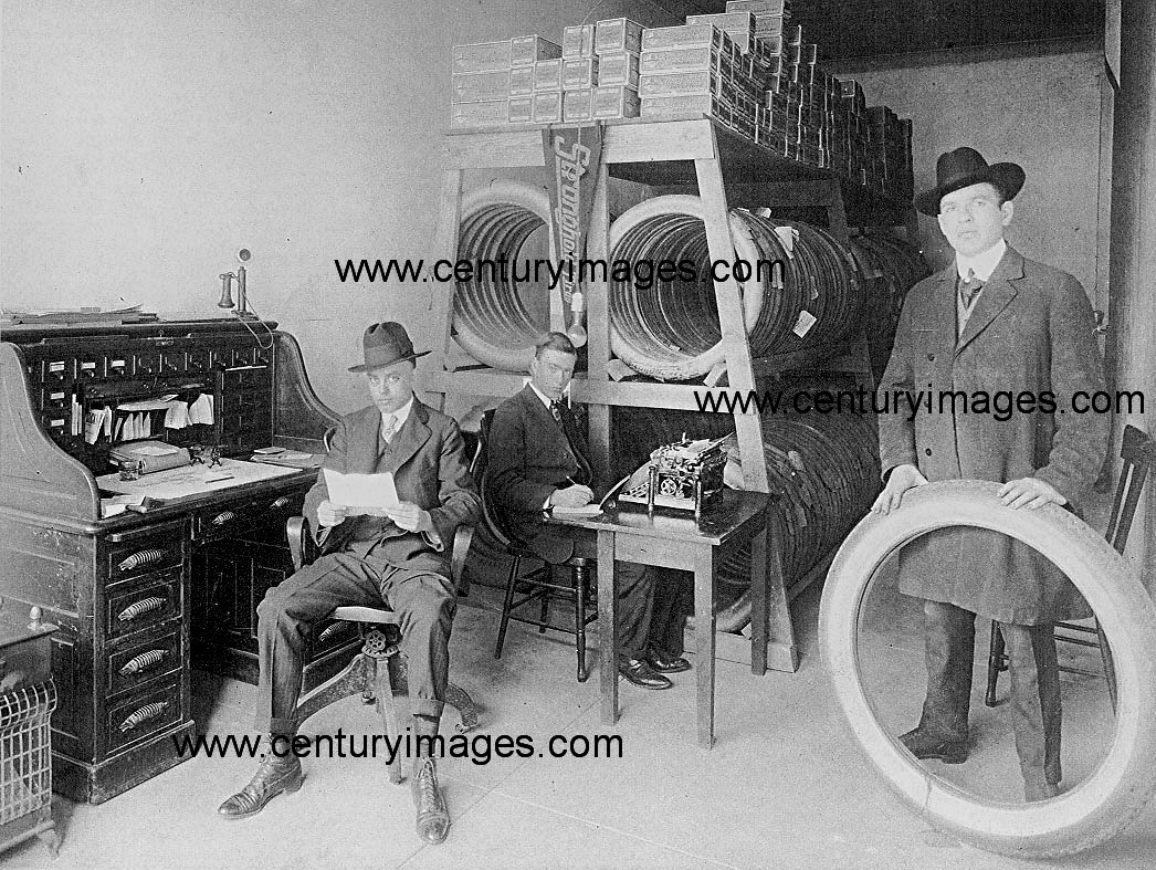 | Office in tire store. No date. Typewriter, candlestick telephone, Star pen rack, pennant advertising Stronghold Tires. | Available from Ronald Beck www.centuryimages.com  |