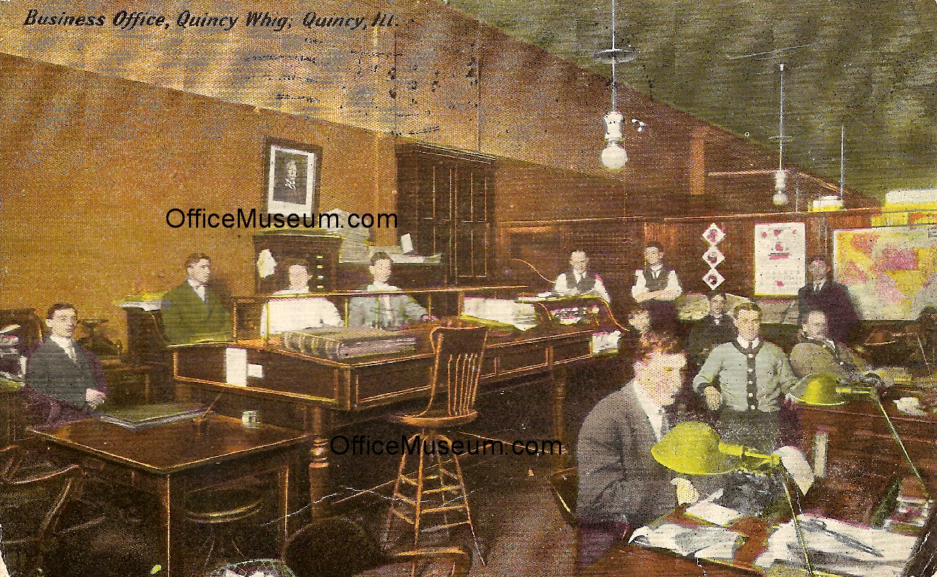 Business Office, Quincy Whig, Quincy IL, 1910, postcard dated by postmark. The Quincy Whig, a weekly newspaper, was founded in 1838. In 1926 it merged with the Quincy Herald, and the Quincy Herald-Whig is still published. | Early Office Museum Archives  |