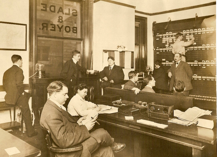 "After Cotton Deal," Office, Slade & Boyer, 1910. Two tickers in front of the windows received securities and commodities prices. Prices of securities, including AT&T's, are posted on the board right rear. | Early Office Museum Archives  |