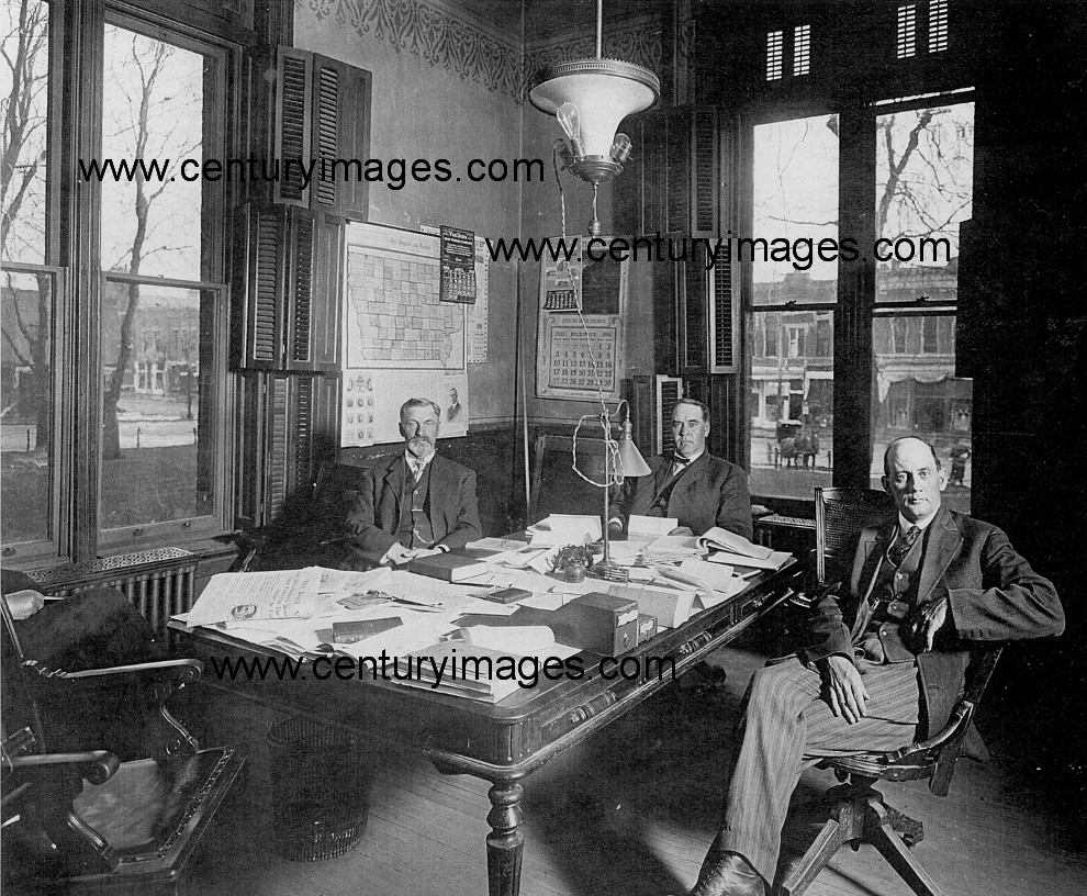 | Three men in office, Iowa, 1911. Location based on map of Iowa on the wall. Date based on wall calendar. Through the window a two-horse buggy is visible. | Available from Ron Beck www.centuryimages.com  |