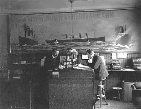 Clerks Woldseth and Wist in the office of the Cunard Steam Ship Co. Ltd., Sřndre Gate, Trondheim, Norway. Trondheim is Norwegian port. The Cunard Line was a British transatlantic passenger steamship company. During the early 1900s, it operated luxury liners like those pictured in the painting on the office wall. One of its most famous ships of that era was the Lusitania, which was built in 1906 and sunk in 1915 by a torpedo launched by a German submarine, with a loss of 1,198 lives.. | Courtesy of  NorwayHeritage.com.  |
