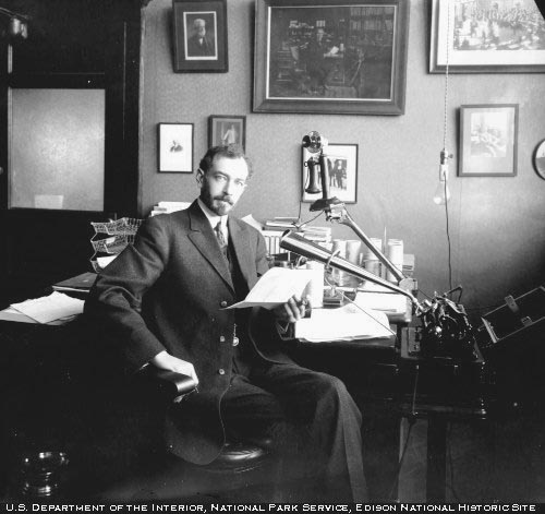 | Nelson Durand with Edison dictating machine, West Orange, NJ. On wall top center is a 1908 photograph of Thomas A. Edison at his desk with an Edison dictating machine. That photograph of Edison is included in the Early Office Museum exhibit on office photographs for 1904-1909. | Edison National Historic Site, Image 14.225/172. | |