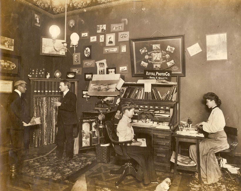 aside from five years (c. 1922-c. 1926) that he operated the Gillette Tire & Battery Co.  One vintage publication identifies him as a commercial photographer. During 1905-17, his studio was the "Royal Photo Co," the name that appears in this photo.  Until 1917, he spelled his surname "Gillett" without an "e" at the end; this is the spelling in the photo. During 1917 he began to spell his surname "Gillette," with an "e" at the end. During 1917-21 the name of his photography business was "Royal T. Gillette Studio." This photo includes a safe with the name "Royal Photo Co," a letter copying press, an Automatic Electric Desk Stand telephone (introduced in 1899), and a nickel-plated Oliver No. 2 typewriter (sold during 1896-1900). The telephone and typewriter were identified in an article by Peter Weil (ETCetera No. 77, Mar. 2007). Weil's article includes another photograph of this same room taken at nearly the same time. Weil's photo includes a calendar with February 1 on a Tuesday, which is consistent with 1910 or 1916. The appearance of the room, the clothing, the hair styles, and the absence of anything that had not been on the market by 1900 suggest that 1910 may be more likely than 1916.  |