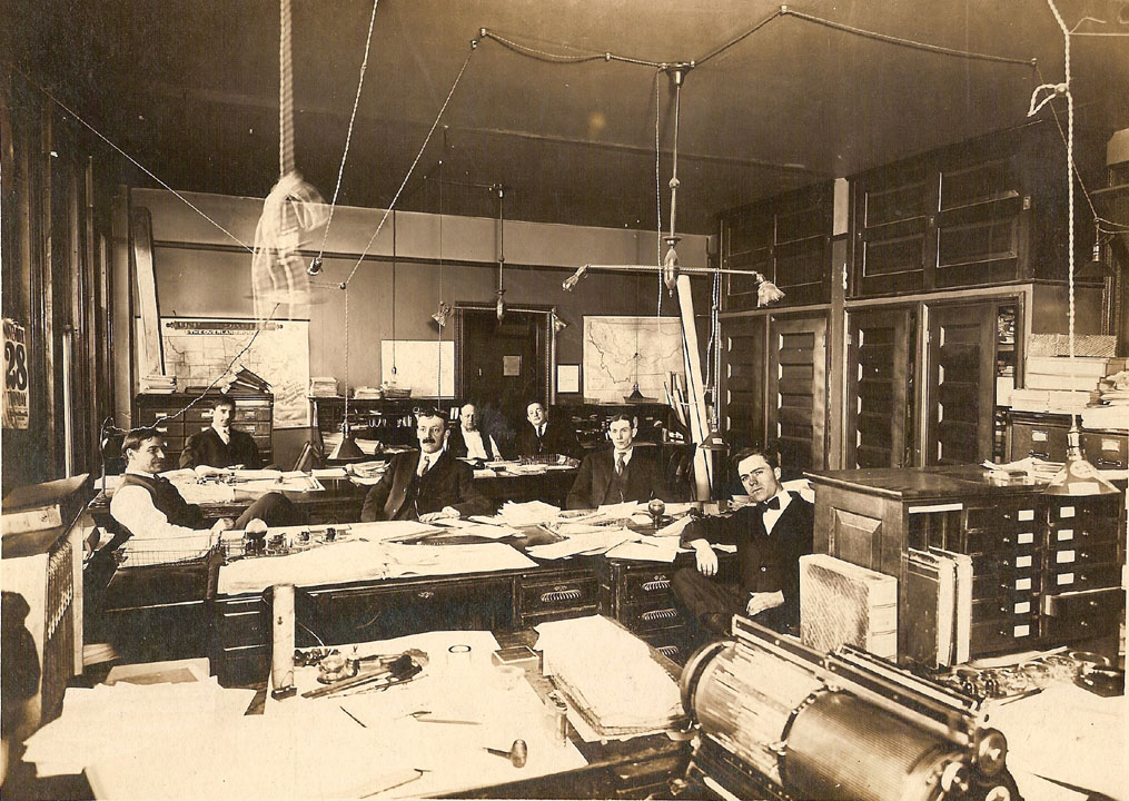 Office with seven men, probably in Montana. On the wall are maps of Montana and the Union Pacific Railroad's Overland Route. Front right is a Gammeter Multigraph. | Early Office Museum Archives  |