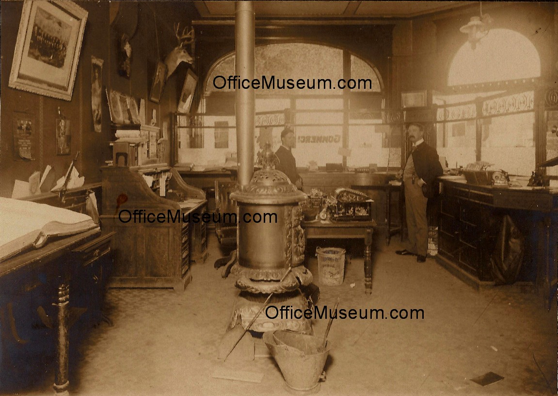 Office with two men, Cincinnati, OH, 1910. Includes typewriter, kerosene lamp, safe, letter copying press with a copying book, candlestick phone, rolltop desk, and cast iron stove. | Early Office Museum Archives  |