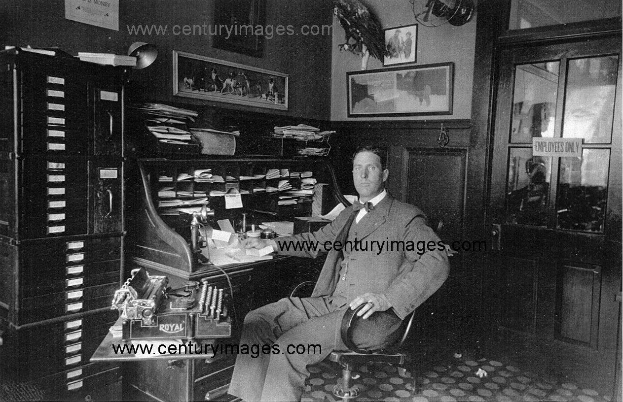 Man at roll-top desk with 1911 Royal No. 5 flatbed typewriter, combination filing cabinet with two document files and many legal blank files, electric fan and stuffed bird. | Available from Ron Beck www.centuryimages.com  |
