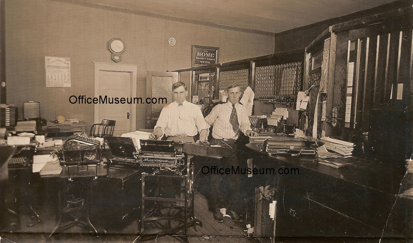 | The counter and screen indicate that this is a retail office. A sign on the wall advertises the Home Insurance Company of New York, and this photo may show an office of that company. The wall calendar is for September 1920 or 1926. Machinery includes a Burroughs Adding Machine and a Todd Protectograph checkwriter. The later model was introduced in 1913. | Early Office Museum Archives  |