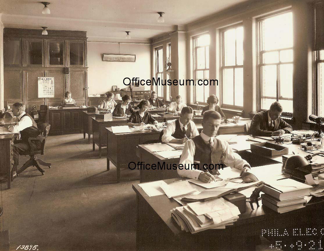 Office, Philadelphia Electric Co., Philadelphia, PA, 1921. Two of the desks have Comptometer calculating machines and one has what may be a Burroughs Calculator, suggesting that this is an accounting office. The wall calendar advertises "Wm. F. Ruwell ~ Machinist ~ Engineer." William F. Ruwell had a business in Philadelphia, PA, already in 1908. | Early Office Museum Archives  |