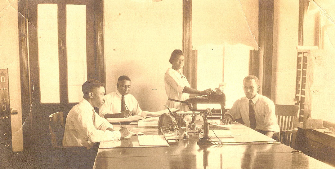 Four African Americans working in an office in Hempstead, TX. In the center is a Burroughs Class 3 adding machine. A candlestick telephone is on the desk. | Early Office Museum Archives  |