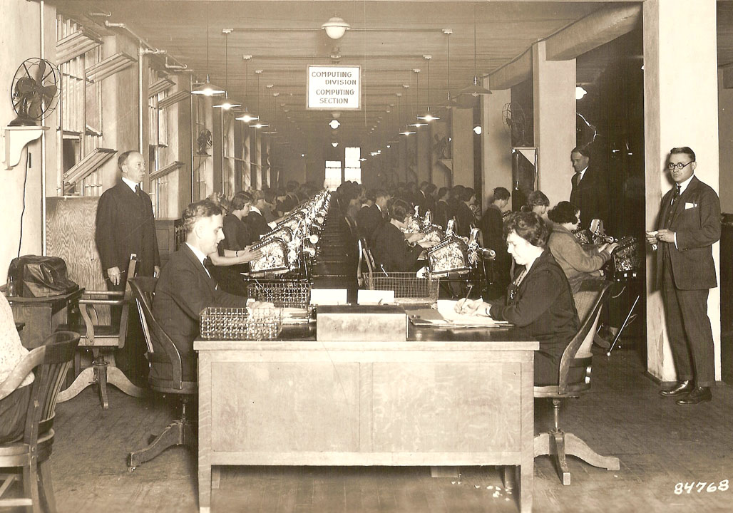 | Computing Division, Veterans Bureau, Washington, DC, early 1920s. Photograph shows at least 30 workers using Burroughs electric adding machines to compute bonuses for World War I veterans. Eleven electric fans are visible. | Library of Congress, Prints & Photographs Div. | |