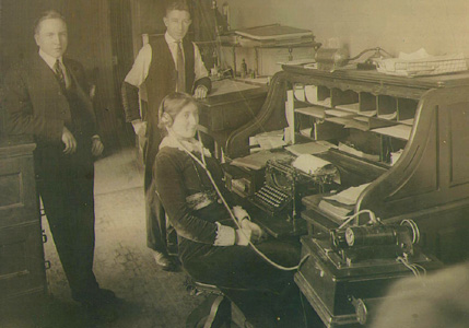 | Office with two men and a woman at a roll-top desk using a front-strike typewriter and a dictation transcribing machine, 1920. | California State University, Sacramento, Education Department, IMET. | |