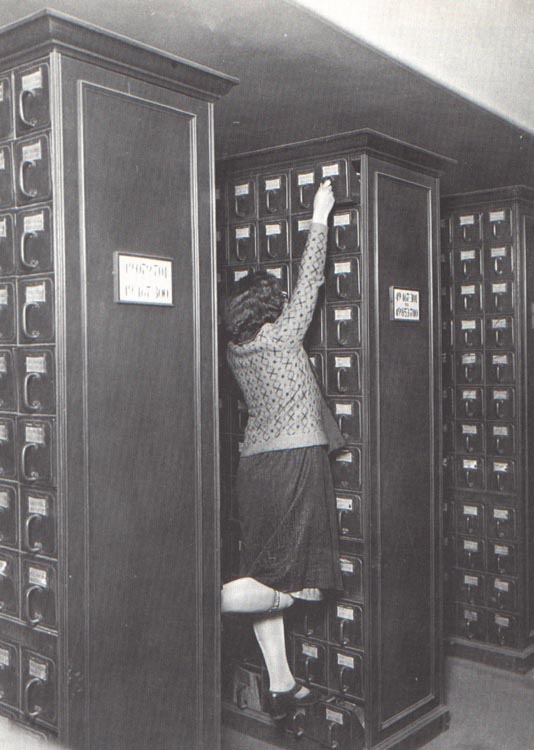 The two photos to the left were taken at the same company. The top photo shows a large number of women typing addresses onto stencil cards for use in addressing machines. A few other women are filing the cards. Cases in the back left and right of the photo hold large numbers of trays (or drawers) full of address cards. The bottom photo shows a large number of women filing the type of address cards that are being typed in the top photo, supervised by a man (standing just right of center). Cases behind the women hold large numbers of trays full of address cards. These photos were evidently taken at a company that used an extremely large mailing list. This may have been an insurance company with a large number of policy holders, a mail order house with many customers, or a periodical with many subscribers.  |