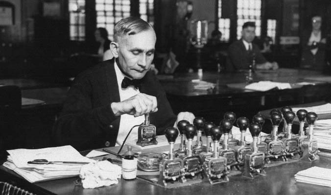 Man with eighteen Bates numbering machines. This photograph and the preceding two were taken at the same company. | Early Office Museum Archives  |